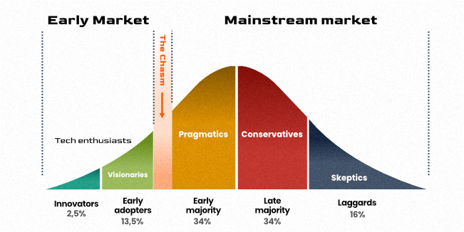 Geoffrey A. Moore’s book Crossing the Chasm explains how difficult it was to move a product from innovators/early adopters to a majority stage.
